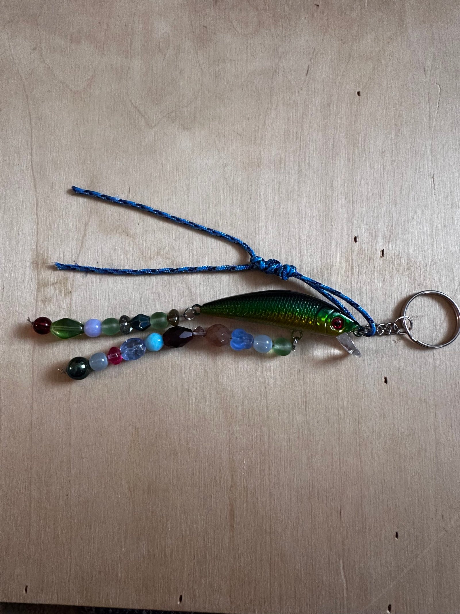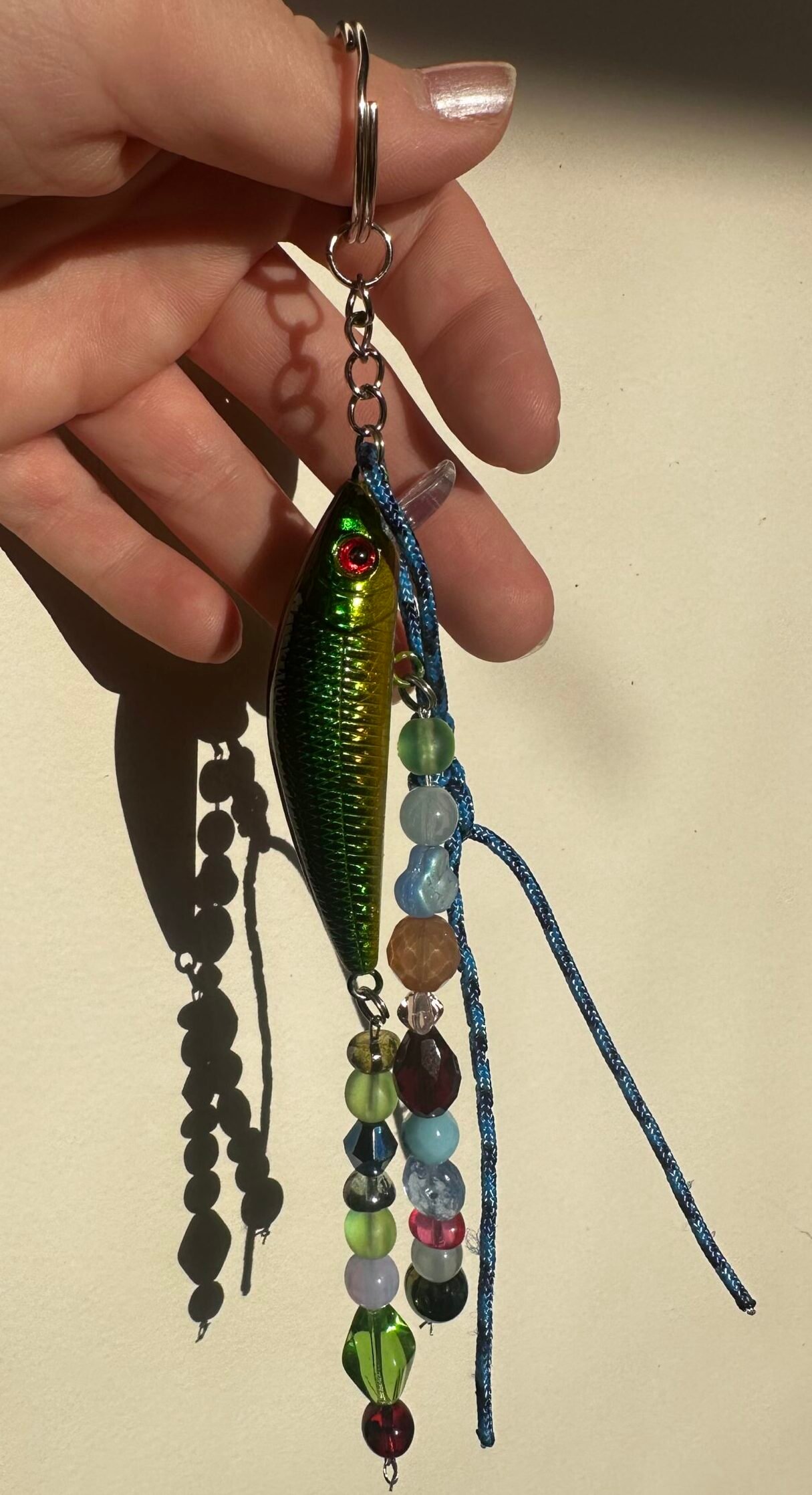 Be sure to clean your bag charm with a gentle rag and warm water. Do not soak the charm or fully submerse in water. Though the fishing lure itself is good in water, we don’t want to loosen any of the beads or paracord. Try to avoid sharp objects that may overly scuff or scratch the lure. She is durable but just be careful to extend this green fishing lure bag charm’s lifespan!