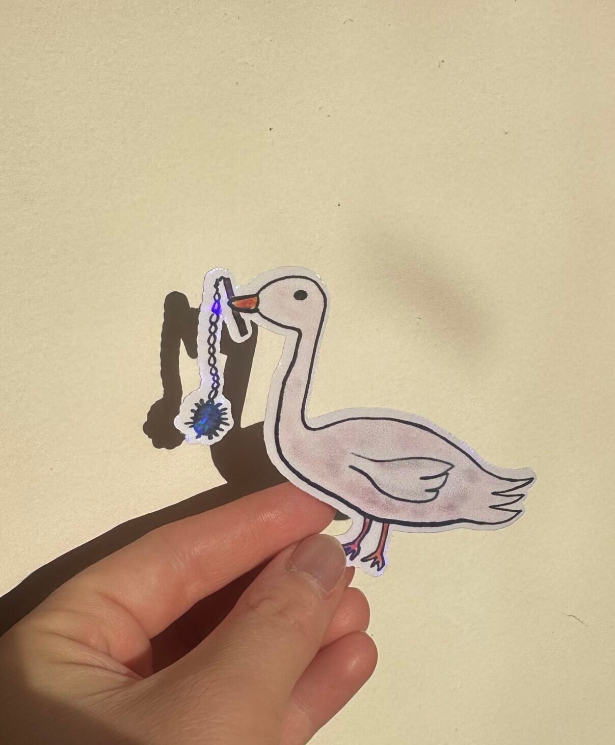 Silly goose! Silly goose with a menacing medieval weapon? Alright! This glossy sticker will add some fun to your water bottle, laptop, notebook, or whatever. Remind those around you that you are fun but not to be messed with. Or else…..
